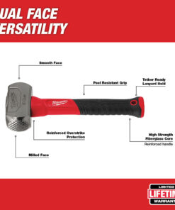 The Milwaukee 3LBS/1.36KG Fiberglass Club Hammer features one milled and one smooth faced for unmatched versatility on jobsites. The milled face grips chisels, punches, stakes, and spikes to reduce slippage or mis strikes, while the smooth face can be utilized for a wide range of striking applications. The drilling hammer is designed with a high strength fiberglass handle and reinforced overstrike protection to offer ultimate power and durability. It is also precision balanced for ease of use and provides forceful blows with less effort.