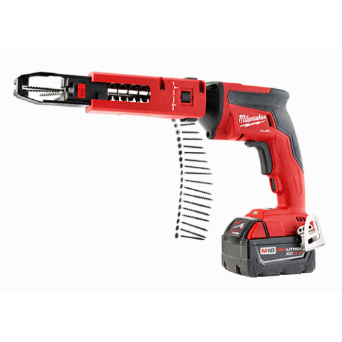 The Milwaukee® M18 CA55 Collated Screw Gun Magazine was designed to work with the M18 FUEL™ Drywall Screw Gun to increase productivity. It feeds screw strips smoothly and has a tapered nose cone to fit into compact spaces. The screw depth adjustment is flushed so that it is not accidentally adjusted. The screw length adjustment works with screws up to 2” and all major brands. The Auto Start Mode on the M18 FUEL™ Drywall Screw Gun continues to work with the attachment while reducing noise between screws and providing 3X longer life.