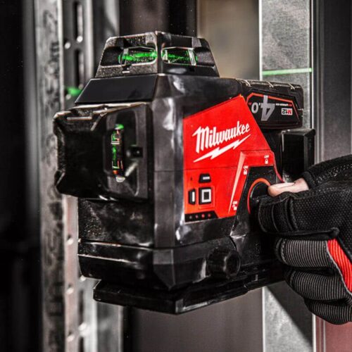 - M12™ green 360° 3 plane laser provides an all-in-one functionality with one horizontal line and two vertical lines for fast and easy alignment, leveling, squaring, and transfers allowing you to easily layout large spaces with one tool