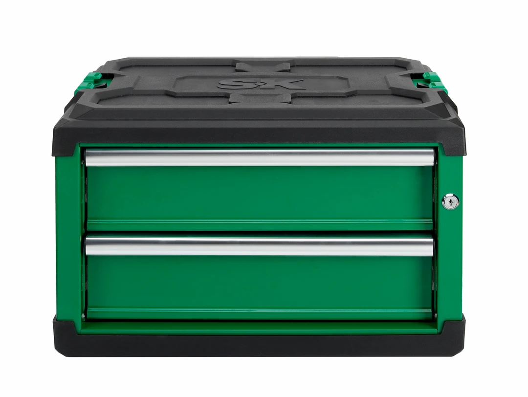Introducing the SK 2-Drawer Modular Tool Box – Organizer for Storage, a robust steel companion designed to streamline your tool organization with durability and convenience. Crafted with aluminum side and drawer handles, its high-quality coating enhances rust resistance, ensuring longevity and reliable support for heavy loads. Equipped with a patented auto-locking system and side latch, this mechanic’s tool box ensures secure stacking and swift connection of stackable units, facilitating convenient transportation. With a lock and two snap keys included, your tool collection stays protected at all times. Each drawer boasts a generous 60 lbs capacity and features a standard SK liner, safeguarding your tools against scratches while minimizing noise. Experience effortless movement with smooth ball bearing slides on every drawer. Seamlessly integrate these steel boxes and cabinets with our SK Mechanic’s Dolly Cart on Wheels or any existing SK stacking module for a customized tool storage solution that meets your exact needs. Revolutionize your workspace with SK’s reliable tool storage solutions.